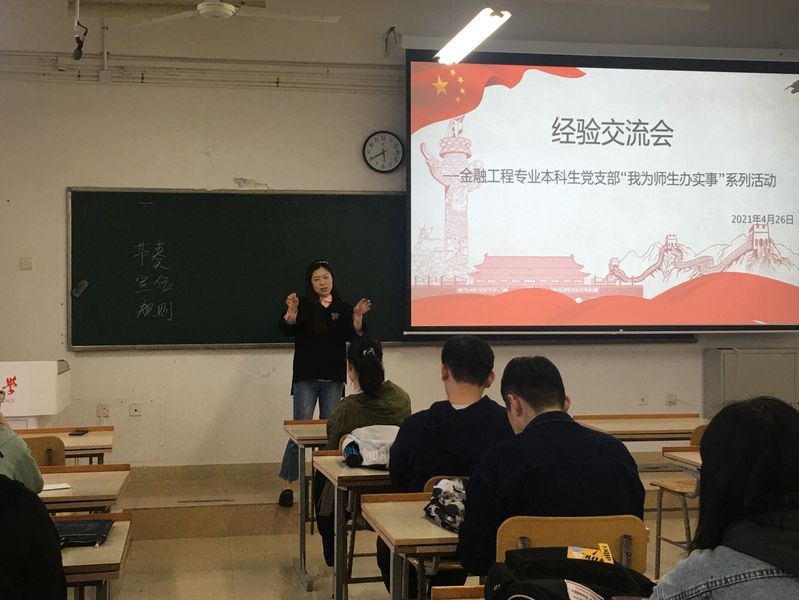 学习结束后,支部开展了“我为师生办实事”系列活动之经验交流会。四年级中保研、考取研究生、成功求职和有丰富实习经验的成员面向三年级同学分别作了分享。张京晶、王鑫等四名同学从参营论文、推荐信的撰写等方面作了保研经验分享;周丽萍和胡孟凡介绍了自己的考研经验;胡孟凡、金海成分别分享了在银行、投行实习的经历和感受;李绪康和蒋以鑫两位同学分享了找工作时在目标选择、笔试面试等方面的经验。