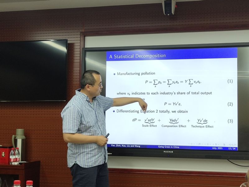 在10号下午,学术交流活动分两场举行,樊教授首先汇报了题为“Going Green In China: Firms’ Responses To Stricter Environmental Regulations”的工作论文,介绍了严格的环境法规对企业环境实践、经济绩效和环境创新的影响,并发现企业面临的更严格的环境法规会更大程度地降低COD排放,并且不同污染强度的行业间存在明显的异质性效应。此外,樊教授进一步指出更严格的环境法规也是企业利润、资本和劳动力急剧下降的原因。随后,qmh球盟会亚博网址研究生江宏露等研究生陆续汇报了自己与导师合作撰写的论文。樊教授针对每一篇论文提出了丰富的修改意见,并与在座其他老师与同学就论文中存在的问题进行了深入交流。