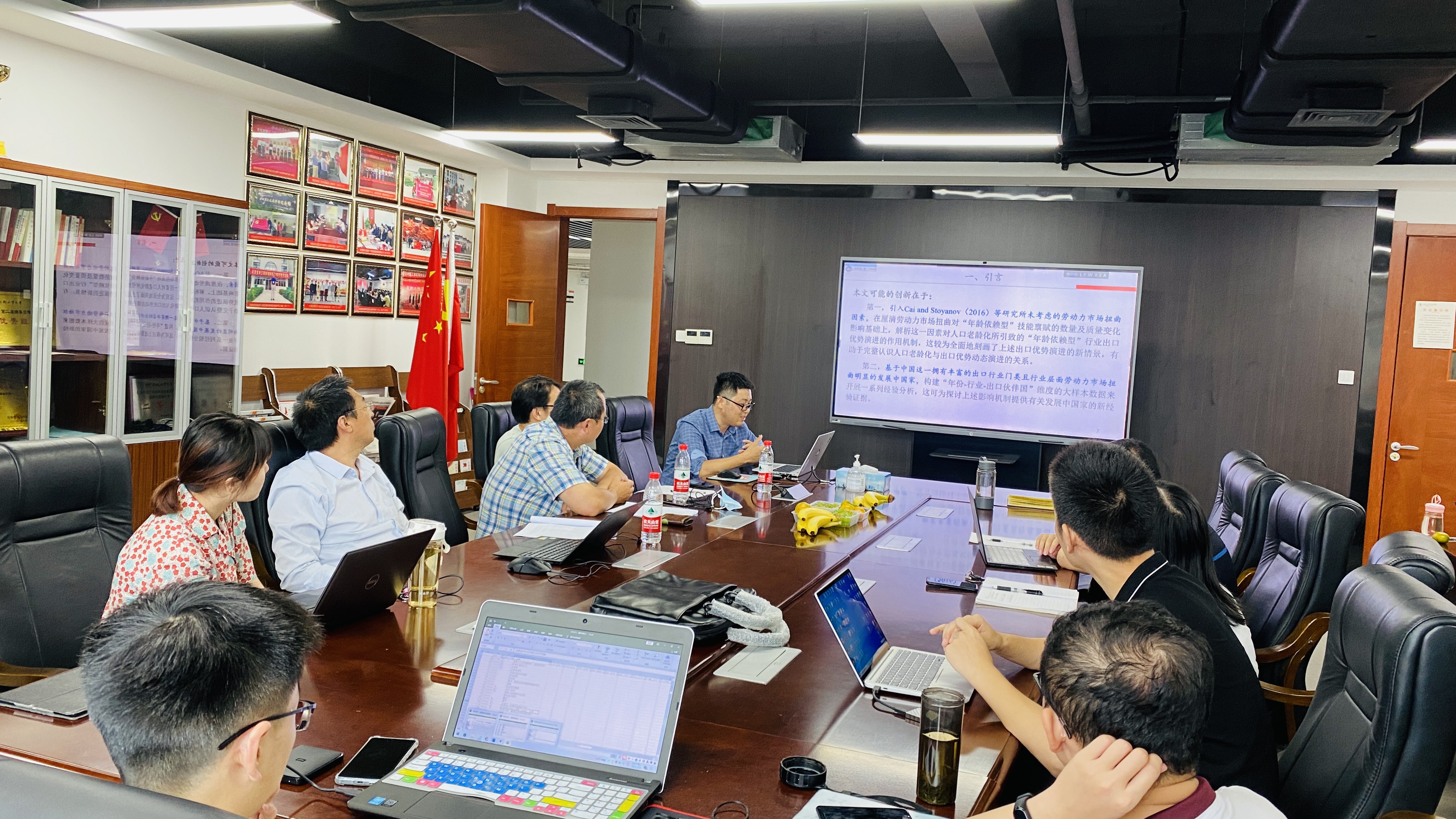 下午第二场学术交流活动,主要由研究生杜艳多、李嘉豪和刘迪分别汇报自己近期的研究成果,樊教授对每篇论文进行了细致的评价,并提出了宝贵的修改建议。其他老师也参与研讨之中,并给出了相关建议。