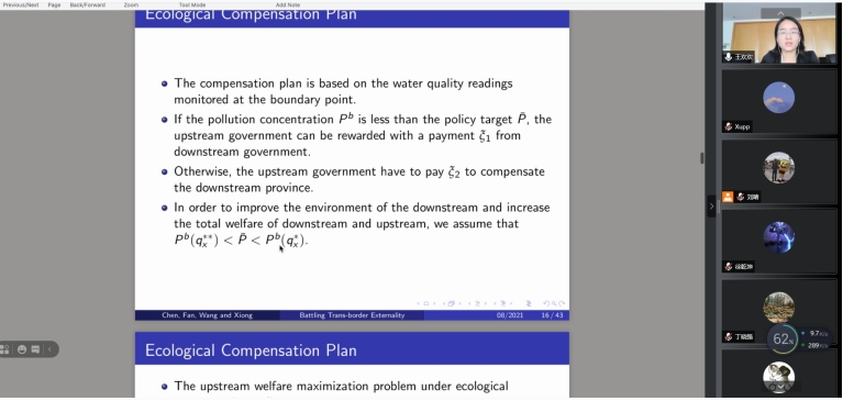 在第一场活动中,王欢欢教授首先汇报了工作论文“Battling Trans-border Externality: Evidence from Cross-jurisdictional Ecological Compensation in China”,报告由张先锋副院长主持。王老师以新安江的跨省污染治理为例,从理论与经验两个方面细致探讨了跨界外部性的应对之策。针对qmh官网师生对论文中模型构建与机制识别等提出的问题,王欢欢教授进行了耐心的解答。在第二场交流活动中,王欢欢教授就交叉学科的研究心得、Journal of Economic Surveys 期刊介绍、新文科与一流课程建设和全英文授课经验等三个方面进行了分享与交流。