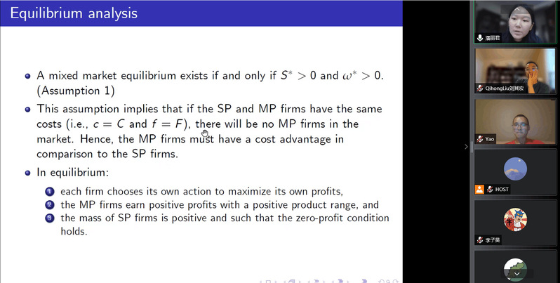 学院洪进院长致欢迎词,并简要介绍了qmh官网的学科发展情况,张先锋副院长和刘晴老师分别主持了上下半场学术交流活动。南京大学潘丽君老师汇报了论文“Horizontal Merger Analysis with Endogenous Product Range Choice”,文章通过建立一个理论模型研究多产品企业的合并行为,多伦多大学罗耀老师对论文进行了细致点评。随后罗耀老师汇报了题为“Imperfect Competition and Rents in Labor and Product Markets:The Case of the Construction Industry”的论文,由潘丽君老师进行点评,与会学者对论文展开了热烈的讨论。浙江大学周默涵老师汇报了论文“The Misallocation Cost of Environmental Regulation”,从资源错配的角度分析了中国环境政策对生产率的影响,罗耀老师对该论文进行了精彩的点评。中国科学技术大学王潇老师汇报了论文“Favorable Tax Treatment for FDI Firms and Foreign Ownership Wage Premium: Evidence from China”,这篇论文探讨了外资企业支付高工资的来源,复旦大学樊海潮老师对论文进行了细致点评。中国农业大学林发勤老师汇报的论文题为“Labor Market Flexibility and Domestic Value Added:Evidence from the Hukou reform in China”,从劳动力市场规制制度变化角度评估了中国劳动力市场流动性的调整带来出口国内增加值的影响,王潇老师对论文进行了全面点评。