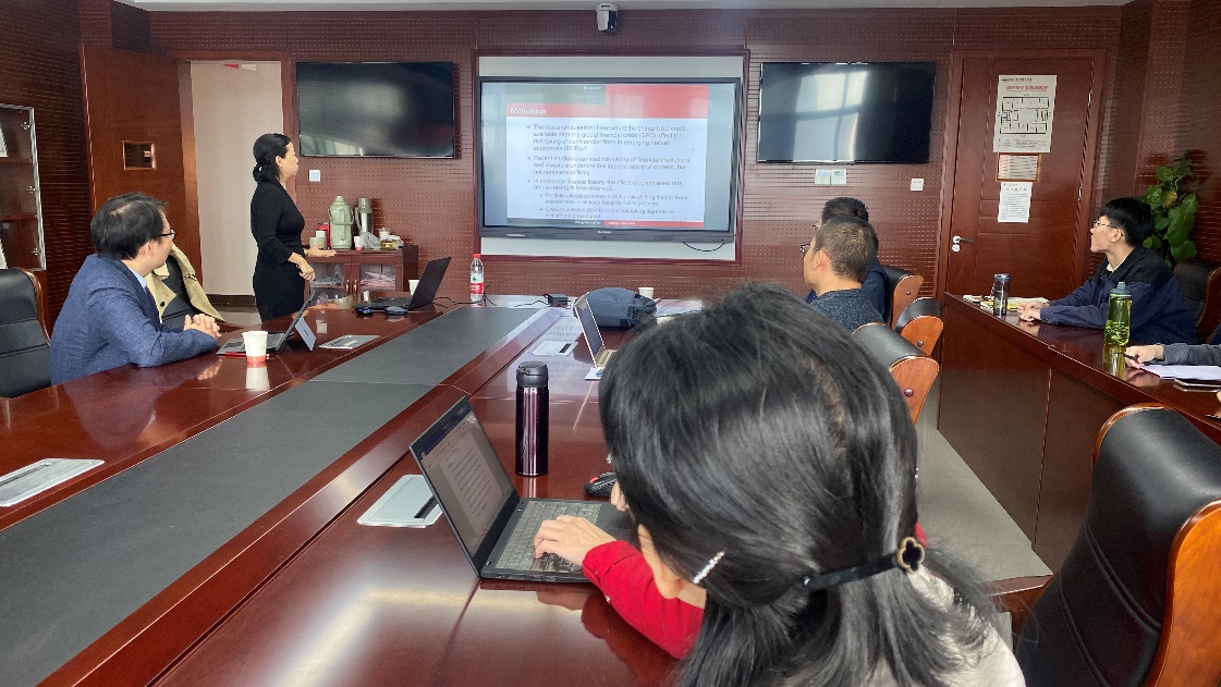 第一场活动是开展卓越讲坛第三十六讲。刘晴主任主持讲坛,20余位学院师生参与此次活动。王潇教授报告的题目是《Cheap USD Credit: Panacea or Poison? Firm-level Evidence from Emerging Markets》。王潇教授探讨了全球金融危机后低价美元债将如何影响新兴市场经济体中非金融企业的风险承担,并发现美元债的发行鼓励企业采取风险行为,这将促进更多的投资支出,但会导致投资效率下降,恶化企业财务状况。在汇报结束后,王潇教授与在场师生进行了广泛和深入的交流。