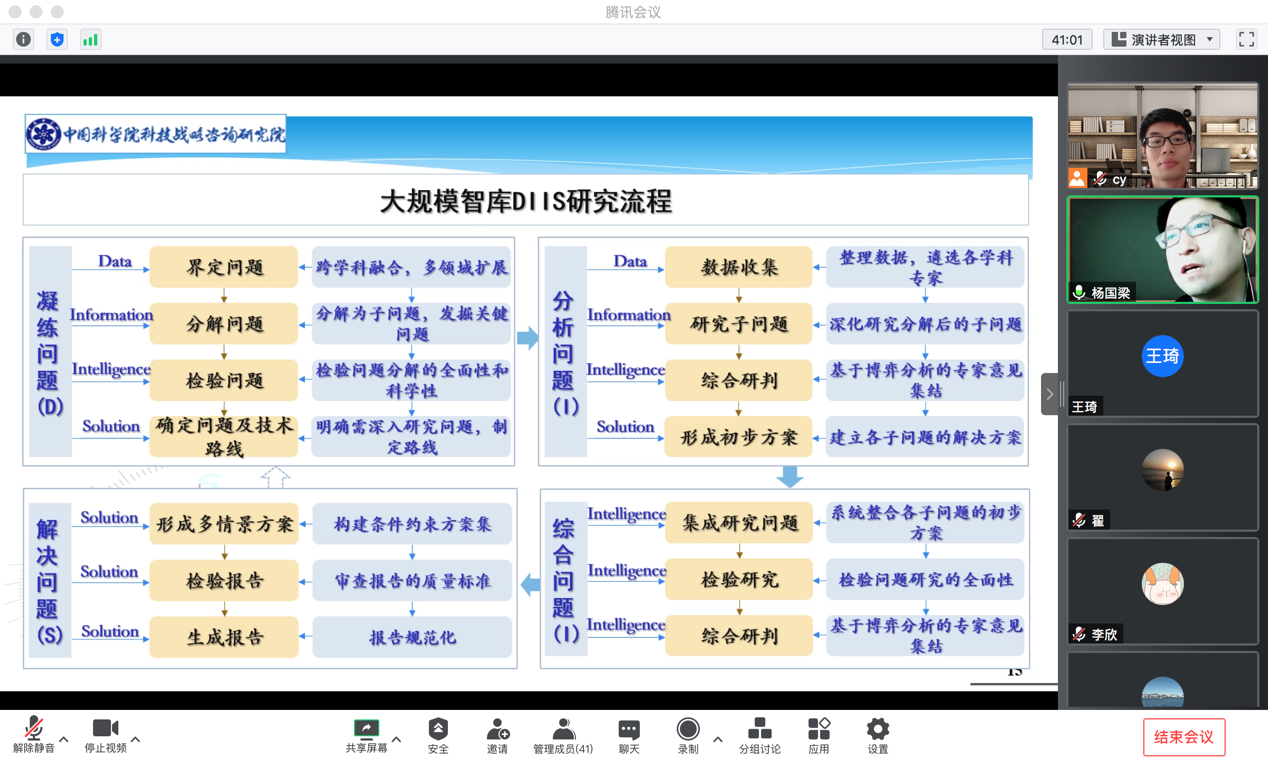 杨教授首先简要介绍了国家开展智库建设的背景,并从不同角度深入分析大规模、中规模、小规模智库问题的特征,形成智库问题规模的划分流程。其次,基于DIIS (收集信息—揭示信息—综合研判—形成方案,Data-Information-Intelligence-Solution)理论,分别提出解决大规模、中规模和小规模智库问题的智库DIIS方法,并剖析三者之间的关系。最后,针对不同规模的智库问题,给出相应的智库报告DIIS写作规范。报告最后,杨国梁教授与在线师生进行了广泛而深入的交流,详细回答了在线师生所提出的一系列问题,包括智库报告优劣的评判标准、不同规模智库问题如何串联与分解等。
