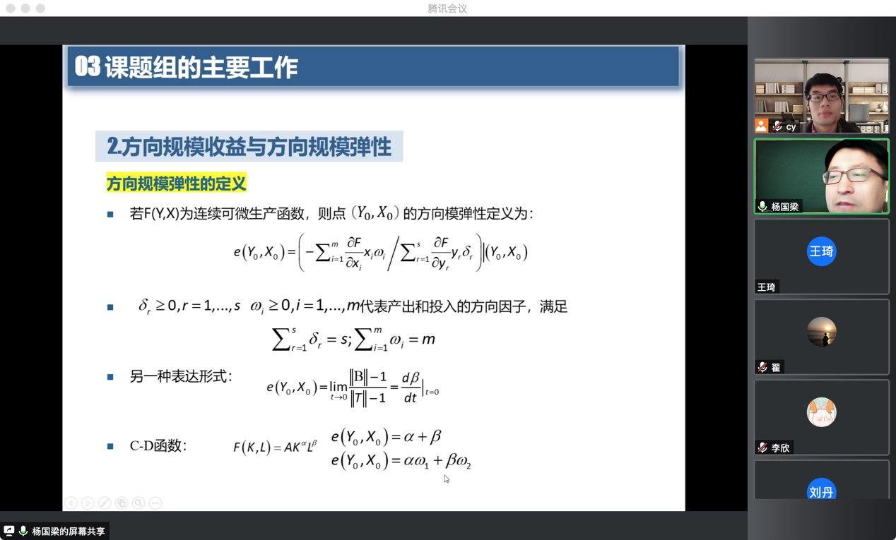 最后,杨教授分享了课题组主要的研究工作和学术贡献,并重点介绍了“规模收益推广至方向规模收益”这一最新研究工作。杨教授从经济学中规模收益和规模弹性的基本概念入手,指出传统文献和经济学教材无法解决现实中不等比例投入的规模收益和规模弹性测度问题,进而提出方向规模弹性和方向规模收益的理论,包括基本定义、测度模型和求解算法、方向规模收益与最优投入方向、方向规模收益与“阻塞”效应等方法体系。与会人员积极提问参与讨论,杨教授一一对问题进行了专业的解答。