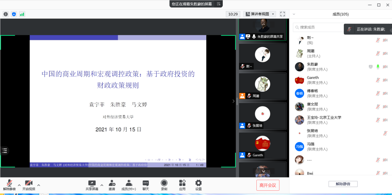 宏观经济论坛由中国人民银行的周潮老师主持,对外经贸大学的朱胜豪老师和中国社会科学院大学傅春杨老师进行点评。朱胜豪老师汇报的论文题目为“中国的商业周期和宏观调控政策——基于政府投资的财政政策规则”。来自厦门大学的王子奇汇报的论文题目为“理性预期的理论基础与应用——以标准新凯恩斯货币政策框架为例”。来自北京工业大学的王宝玲汇报的论文题目为“能源效率、可再生能源生产规模与宏观经济效应”。来自安徽大学的唐文层汇报的论文题目为“新冠疫情冲击下的“用工荒”与“稳就业”—基于搜寻匹配的DSGE模型分析”。各位点评专家对论文的模型构建,机制设计,理论基础,以及政策意义等方面进行了讨论。