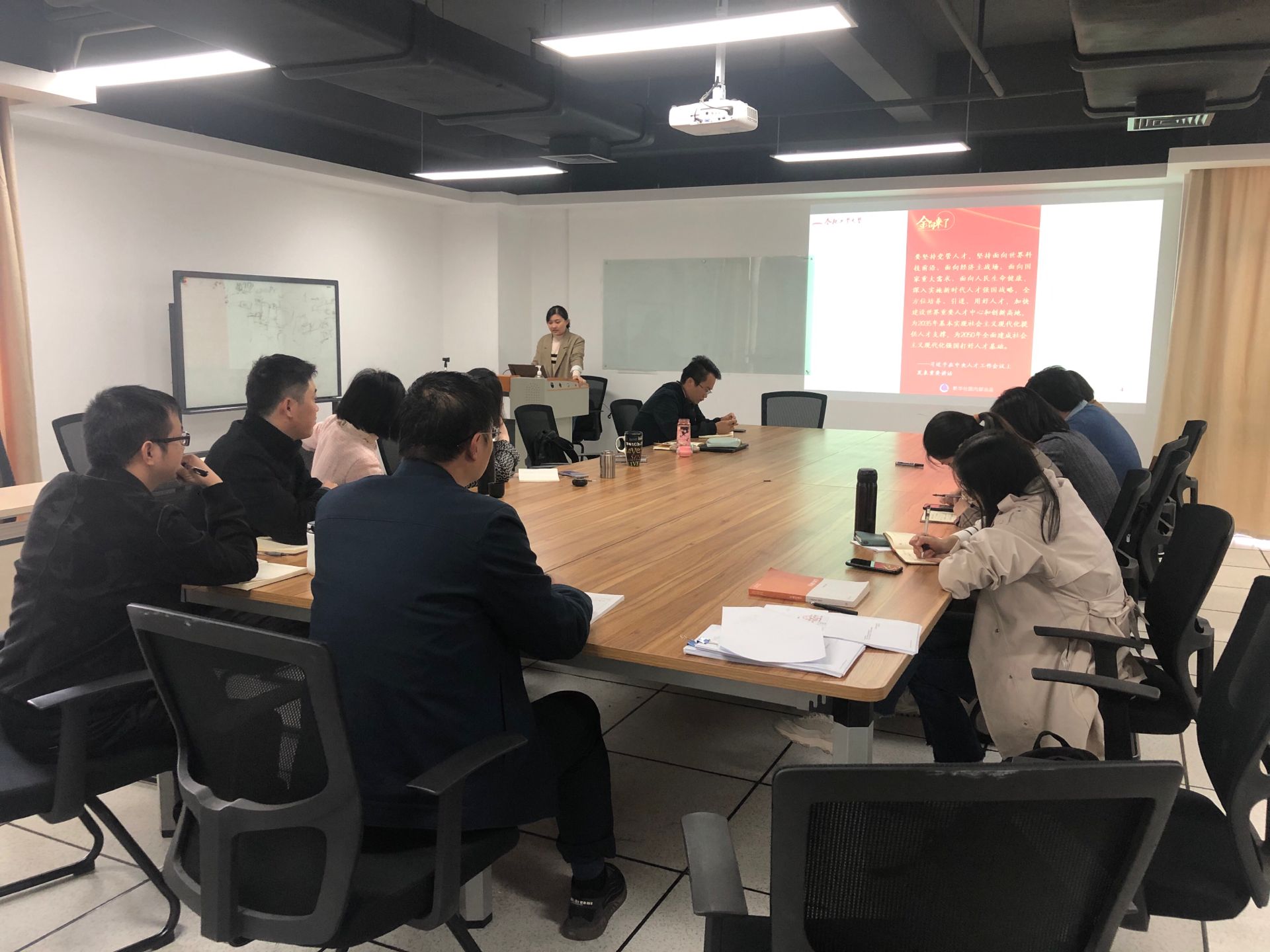 2021年10月27日,国贸系教工党支部全体党员在科教楼B座1008会议室集中学习、研讨习近平总书记在中央人才工作会议上的重要讲话。本次会议由支部副书记王琼老师组织,主要包括三个环节:重要讲话核心要点领学;通过短视频了解重要讲话在全社会各领域引发的热烈反响;与会老师结合自身工作与思考,围绕讲话内容展开充分交流。