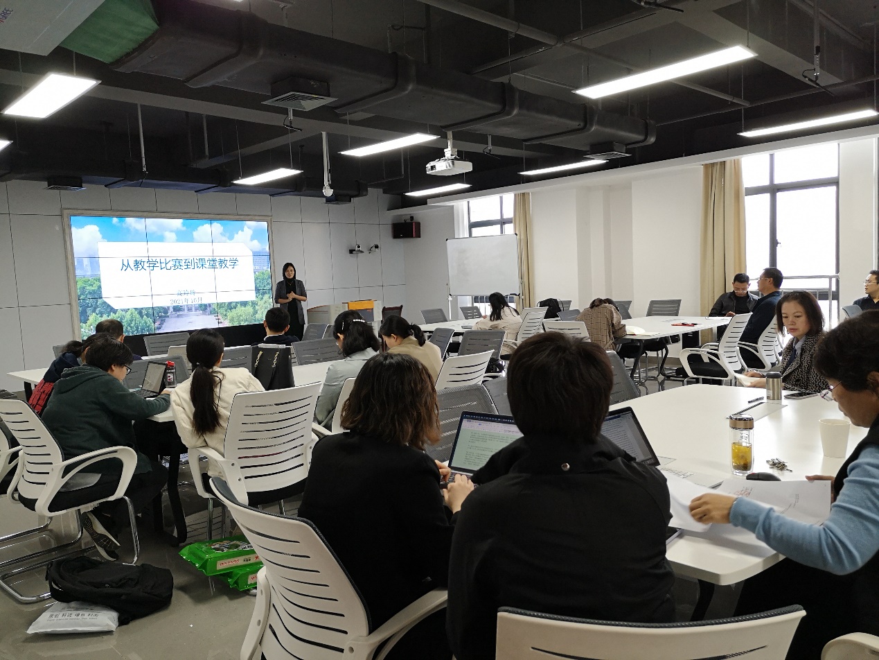 高玲玲老师以“从讲课比赛到课堂教学”为题,从学院今年刚举办的青年教师教学比赛切入,从教学课件、教学内容、教学方法以及其他方面归纳凝练在教学实践中普遍存在的问题,并针对性地逐条提出改进建议。高玲玲老师还指出,课程思政应该将思政元素有机融入课堂教学,做到“润物细无声”,并结合课程介绍了自己的实际做法。最后,高玲玲老师建议,为了提升课堂教学效果,老师们应该花功夫“磨课”,使课堂教学“有趣、有得、有价值”。