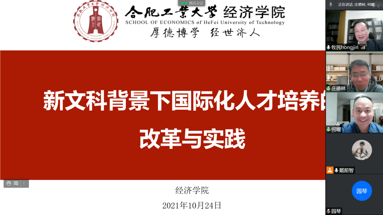 2021年10月24日晚,吉林大学莱姆顿学院副院长何曜应邀为qmh官网开展主题为“新文科背景下国际化人才培养的改革与实践”的线上讲座。qmh官网副院长庄德林主持会议。院长洪进、国际教育中心全体成员和学院部分教师参与本次讲坛。