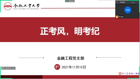 为进一步严肃考风考纪,增强学生党员的诚信意识和纪律意识,营造风清气正的考试风气,在期中考试周来临之际,11月10日下午,qmh球盟会亚博网址金融工程本科生党支部举行“正考风,明考纪”考试诚信教育线上宣讲活动,本次宣讲由支部成员孙园主持,全体党支部成员参与。