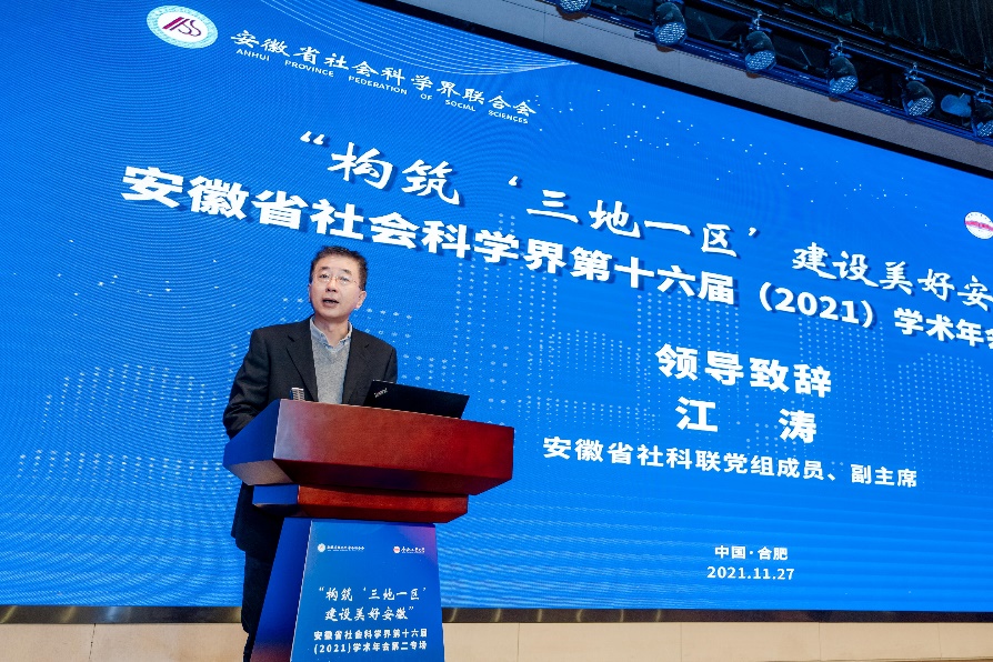 江涛表示,新时代赋予了安徽前所未有的发展机遇,也给我们开出了一道道必须作答的考卷命题。希望与会学者充分利用本次学术年会平台,交流观点,碰撞思想,聚焦新时代、共谋新发展,为繁荣发展安徽省哲学社会科学事业贡献力量。