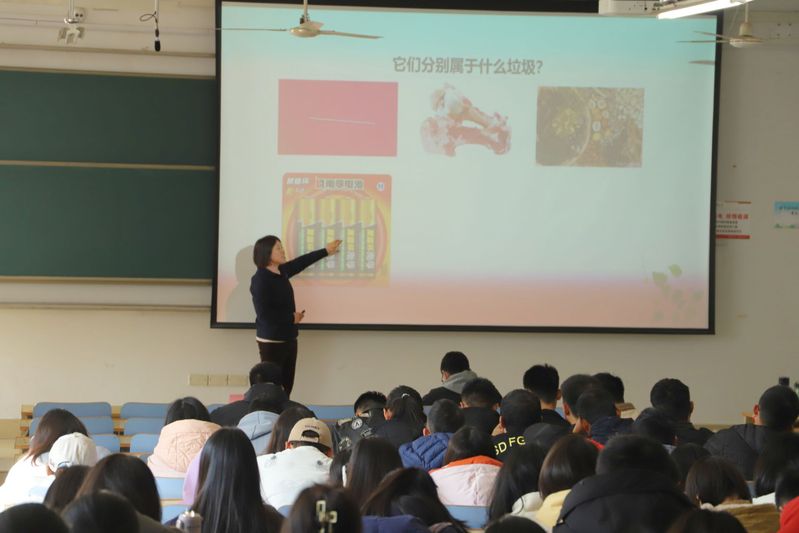 隋老师首先介绍了2022年5月1日正式实施的《安徽省生活垃圾分类管理条例》。接着隋老师详细讲解了目前安徽省合肥市的垃圾分类标准,并逐一介绍了可回收物、厨余垃圾、有害垃圾、其他垃圾的具体标识和划分标准。之后通过提问和讲解的方式,隋老师为同学们讲解了中药药渣、猪大骨等易混淆垃圾,并深入讲解分类技巧。最后,隋老师向同学们普及了各个种类垃圾处理的方法,号召同学们积极响应垃圾分类政策,为文明城市建设贡献自己的一份力量。