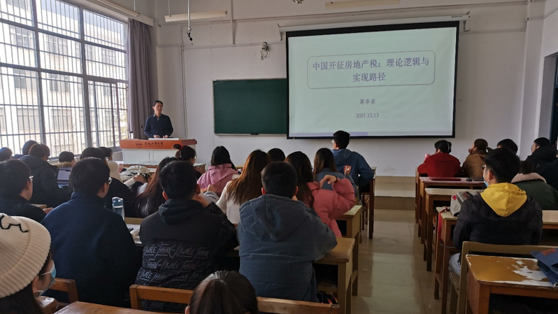 讲座上,周华东首先介绍了中国征收房地产税的背景与现实状况,紧接着引出征收房地产税背后的内在逻辑,向同学们解释了“为什么征收房地产税?”以及政策实施所面临的现实问题。最后,周华东围绕中国征收房地产税的实现路径进行讲解,并对其优化措施做了分析。