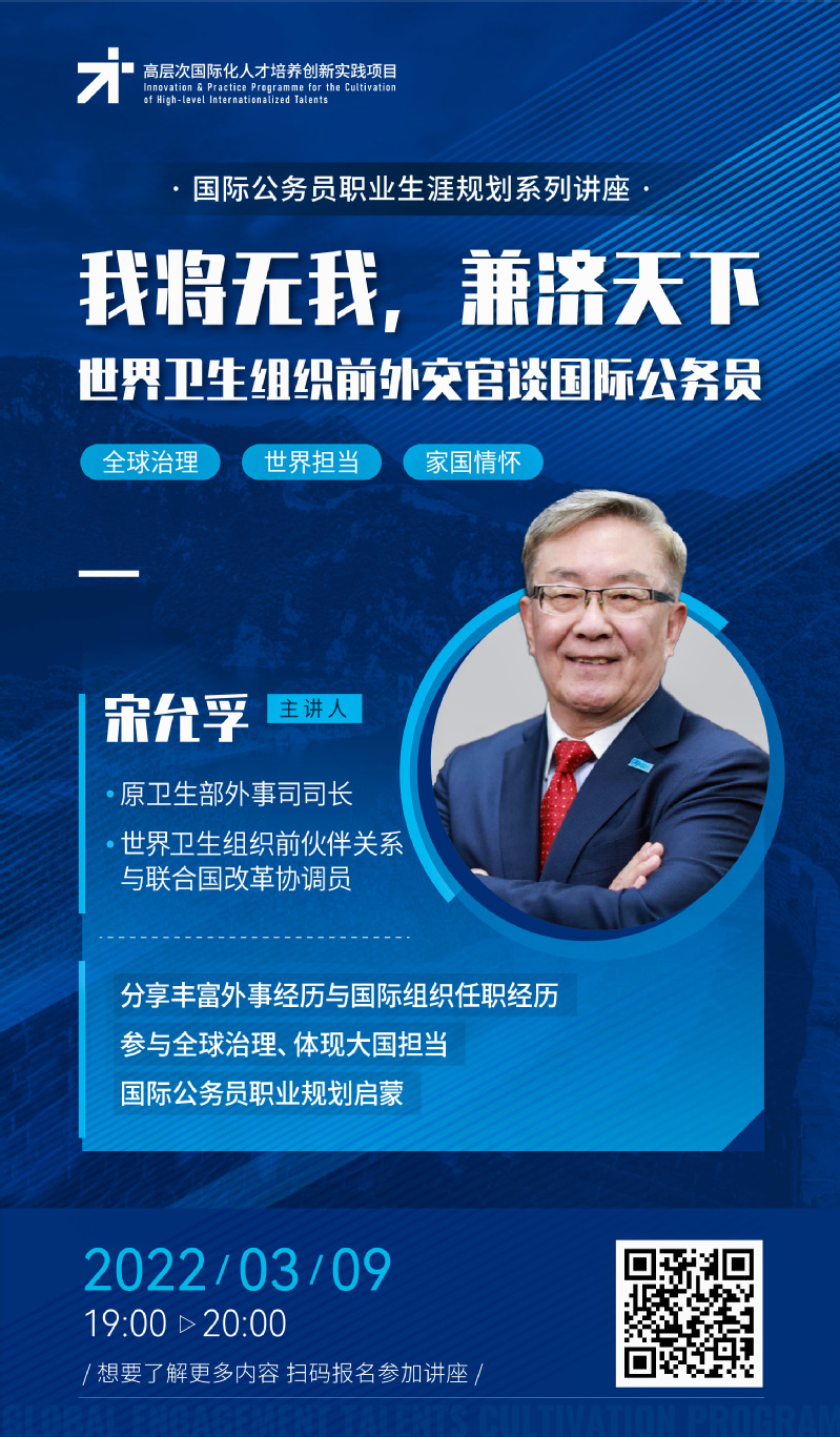 此次讲座为国际公务员职业生涯规划系列讲座第一场,由原卫生部外事司司长、世界卫生组织前伙伴关系与联合国改革协调员宋允孚先生担任主讲嘉宾。宋司长十八岁留学海外,有十四年国际组织任职经历,以及四十余年的外事工作经验。本场讲座将从全球治理、世界担当、家国情怀三个方面,分享国际组织经历,分享全球治理的心得体会,带来国际公务员的职业规划启蒙,鼓励大学生培养家国情怀与国际视野,把握时代机遇,迎接全球挑战!