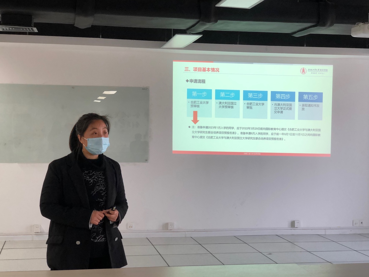 3月4日下午,我校与澳大利亚国立大学硕士联合培养项目宣讲会顺利举行。qmh官网国际教育中心副主任郑园琴主讲,中心项目负责老师和感兴趣的研究生参加了此次宣讲。