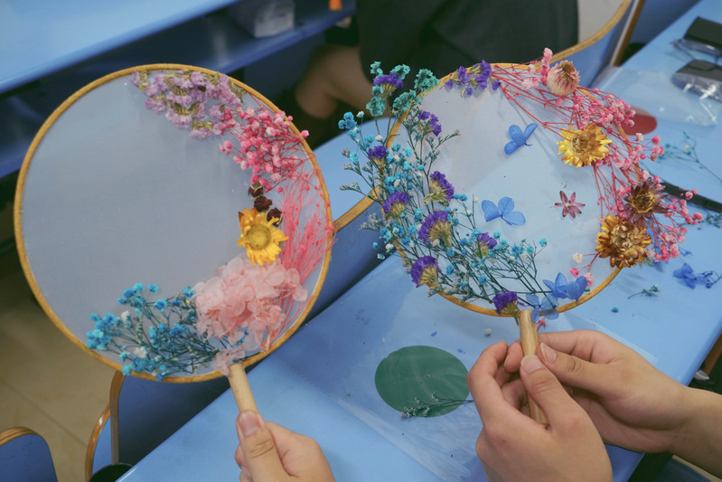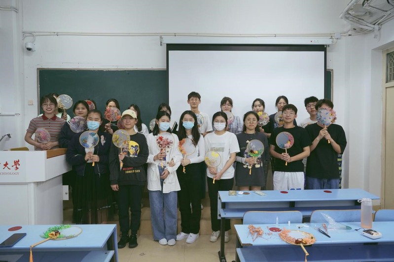 活动现场,活动负责人为学生讲解了团扇的历史来源和制作工艺。团扇,又称宫扇、纨扇,是中国汉族传统工艺品及艺术品,是一种圆形有柄的扇子,代表着团圆友善、吉祥如意。团扇创作过程中,在场的学生们积极投入,利用材料和工具组装扇柄、扇面,并耐心地在扇面上设计、粘贴装饰品,制作出一个个精美的专属团扇。