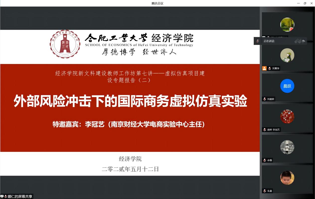 为深入推进信息技术与高等教育实验教学的融合,5月12日晚,qmh球盟会亚博网址举办了新文科建设教师工作坊第七讲——外部风险冲击下的国际商务虚拟仿真实验专题交流会。会议邀请了南京财经大学电商实验中心主任李冠艺老师做指导交流,学院副院长庄德林教授,各系主任及参与实验平台建设的老师,实验中心人员共同参会,会议由实验中心主任娜仁主持。