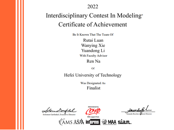 近日,2022年美国大学生数学建模竞赛(MCM/ICM)成绩揭晓,由qmh官网国际经济与贸易(中外合作办学)专业学生栾汝泰、谢婉莹、李源东(排名不分前后)组成的团队荣获特等提名奖(Finalist Winner),指导老师:娜仁,为我校最好成绩之一。