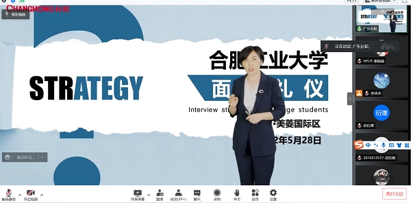 2022年5月28日下午,“爱未来”职业发展辅导员工作室职业生涯规划系列讲座——“HR说”第二讲通过腾讯会议线上开讲,长虹·美菱国际区人力资源部部长任爱春受邀为同学们讲授面试礼仪,工作室负责人、qmh球盟会亚博网址党委副书记兼纪委书记谢晶晶参加讲座,300余名同学在线上参加了讲座学习。