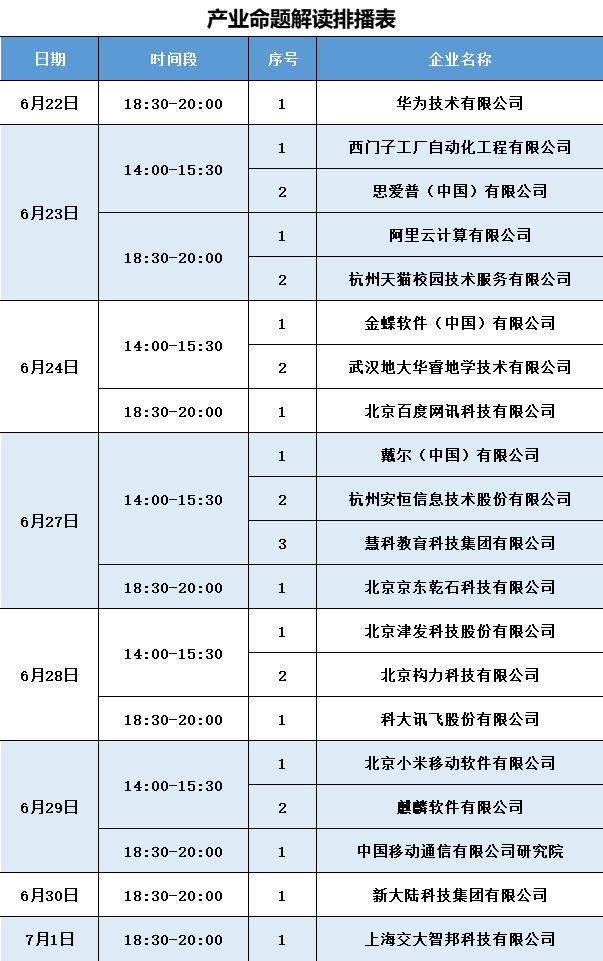 第八届中国国际“互联网+”大学生创新创业大赛产业命题赛道命题直播活动将于 6月22日——7月1日组织开展 。本次活动,根据命题企业意愿,选择部分命题企业从企业情况、命题要求、答题注意事项、可提供的资源支持等方面以线上直播的形式逐一解读命题并为参赛师生现场答疑,促进参赛团队与命题企业充分有效交流,进而确保参赛团队进一步了解产业命题赛道的命题详情。