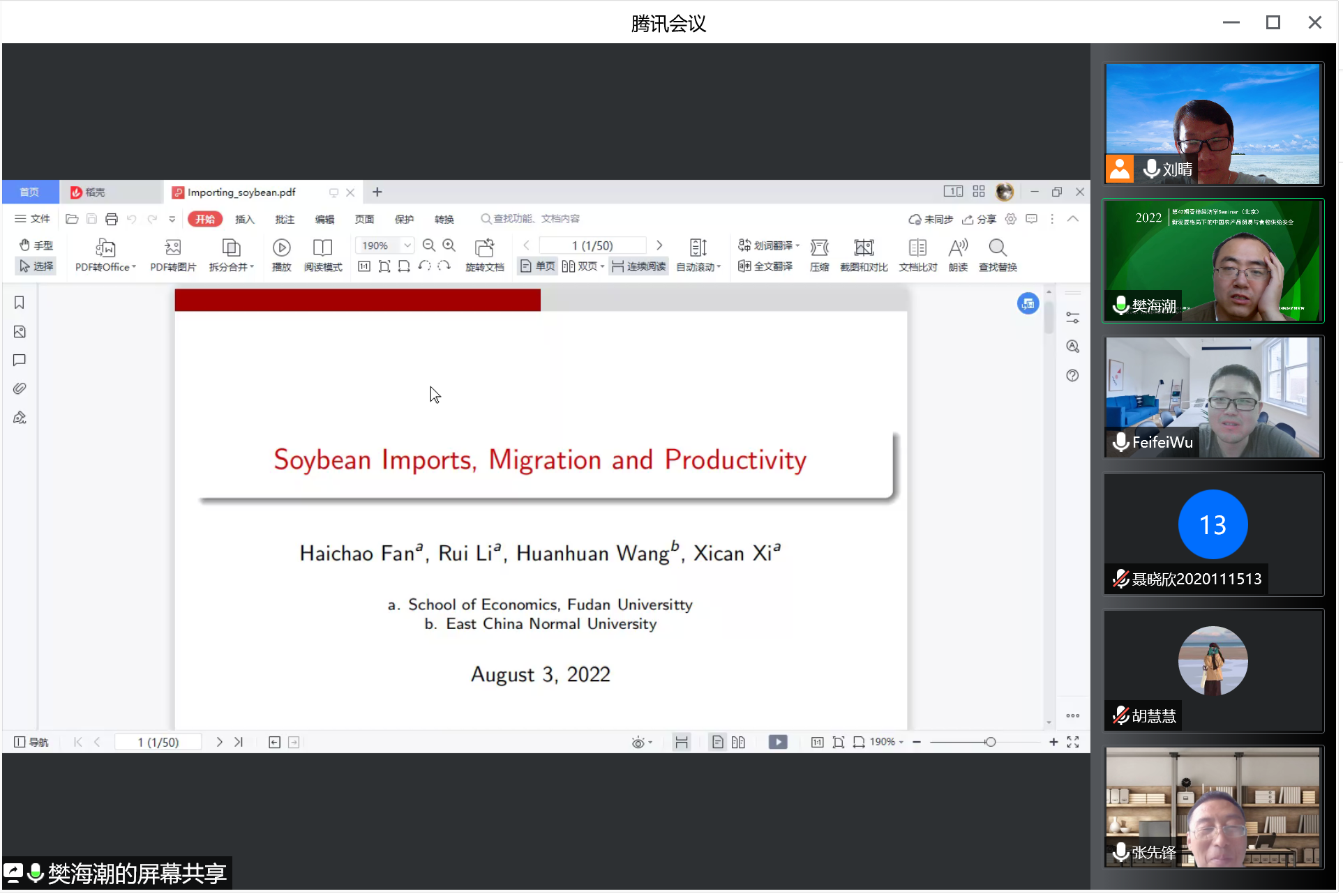 2022年8月4日下午,复旦大学qmh球盟会亚博网址樊海潮教授与qmh官网师生进行了学术交流。此次学术交流以线上会议的形式进行,学院80余位师生参加了交流活动。在学术交流活动的第一场,樊海潮教授为qmh官网师生做了一场主题为“Agricultural Imports, Migration and Productivity”的学术报告,报告会由刘晴老师主持。学术报告从理论和实证两方面分析了农产品关税减免对于农业的系统性影响,报告的思路清晰、论点明确,增强了大家对于国际贸易的理解与认识。随后,樊海潮教授与师生开展了学术交流研讨,就论文写作、文献阅读、学术合作等议题与参会师生进行了积极的互动交流,对部分师生的论文构思进行了指点。