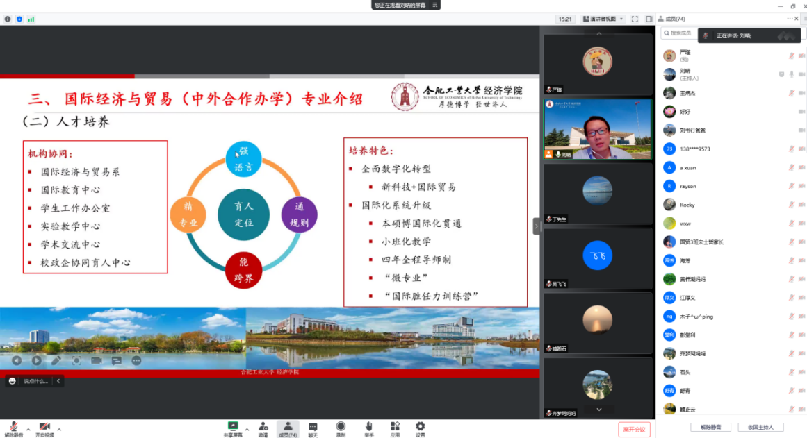 刘晴老师系统介绍了国际经济与贸易专业的人才培养特色与成果。吴飞飞老师以数字经济相关研究为例,详细讲解了大学学习中常用的思维方法。谢众老师以国家双创政策为切入点,重点介绍了学科竞赛在学业学习中的重要性。戴前智与周彤彤老师则全面说明了国际教育中心的教辅功能以及美方合作高校情况。