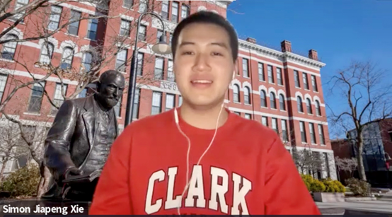 克拉克大学“3+1+1”项目参与学生代表谢家鹏英文发言。他结合个人游览15个国家的经历和个人规划讲述了选择大四期间赴克拉克大学留学的缘由,并表达了成功赴美留学的兴奋与喜悦。此外,他分享了克拉克大学留学体验,包括克拉克大学国际化校园环境和人文环境、课程学习、如何与教授沟通、日常生活等,勉励学弟学妹们要做一个积极的学习者,把握机会,主动适应环境变化,在不断尝试和磨砺中提升自己,努力成为一个具有全球视野的优秀人才。