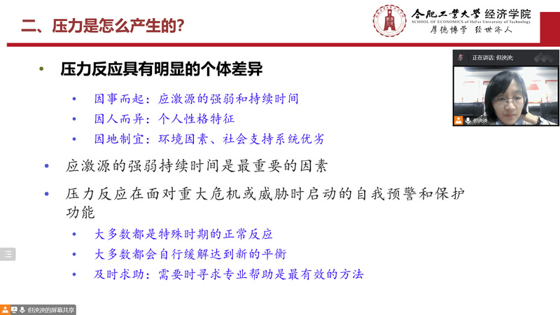 本次讲座主题是“疫情下的研究生情绪调适与压力管理”。但泱泱老师从三个方面阐述本次讲座的主要内容。先是讲解了调节情绪的一些小妙招,第一步先要觉察自己的情绪,第二步要了解情绪的产生原因,第三步是通过“正念冥想”、“蝴蝶拍”等方式调适自己的情绪;紧接着但老师讲解了压力管理,让同学们对于压力源有了进一步的了解,以及如何正确看待压力;最后但老师教同学们应当如何呵护身心健康,并且介绍了一些应对压力的方法。会议最后,但泱泱老师解答了同学们就相关问题的提问。
