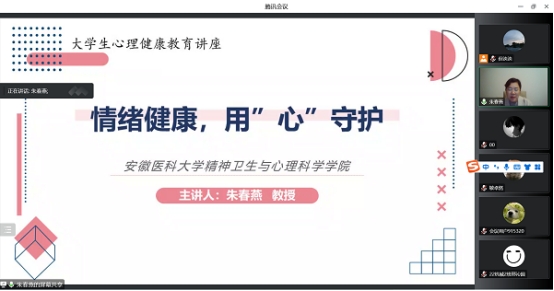 为了引导同学们关注身心健康,帮助疫情下的同学合理调适情绪,缓解心理压力,qmh球盟会亚博网址“经院·润心讲堂”于11月5日晚线上开讲,邀请到安徽医科大学精神卫生与心理科学学院副院长、教授、博士生导师朱春燕为同学开展心理讲座,讲座主题为“情绪健康,让我们用‘心’呵护”,三百余名同学线上参加了讲座。