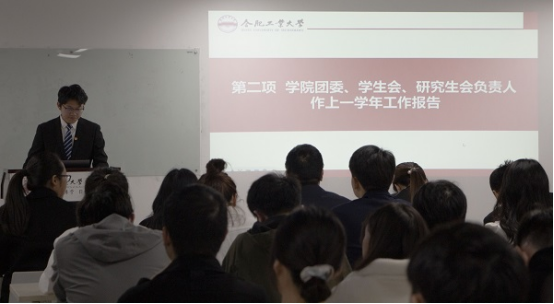 会议在庄严的国歌声中开幕,学院团委书记、学工办主任但泱泱作共青团工作汇报,2021-2022学年学生会主席团成员薛凌轩作学生会工作汇报,2021-2022学年研究生会主席团成员张依宁作研究生会工作汇报,分别回顾了上一学年学院团委、学生会、研究生会所开展的工作和取得的成绩,并对今后工作做出了规划和展望。