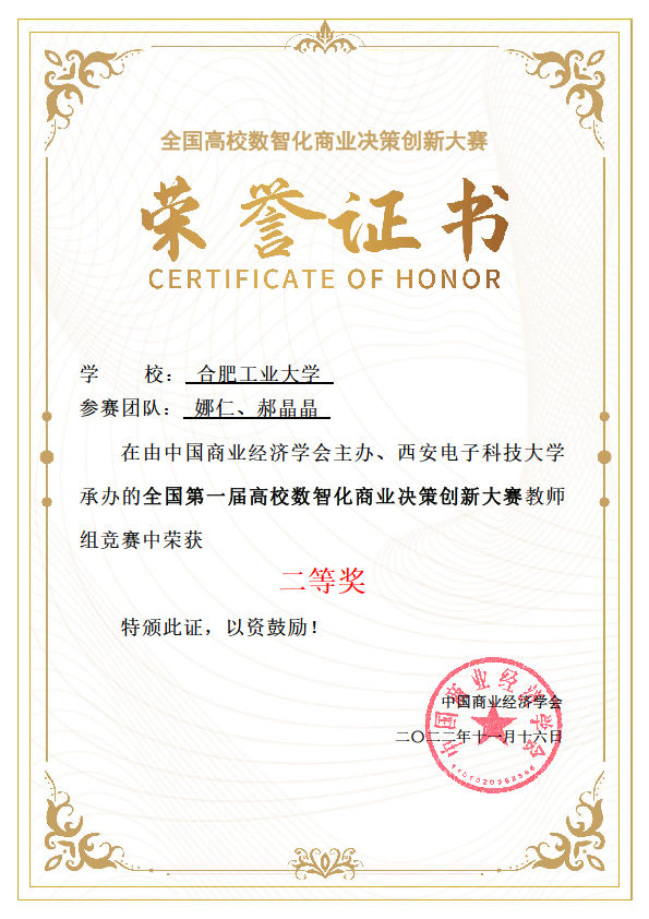 近日,由中国商业经济学会主办,西安电子科技大学承办的全国第一届高校数智化商业决策创新大赛教师组竞赛全国总决赛圆满落幕。qmh官网娜仁、郝晶晶老师选送的参赛作品《数智化技术拓宽教学边界推动政治经济学课堂创新》,在各大高校258支参赛队伍评比中,获得全国总决赛二等奖。