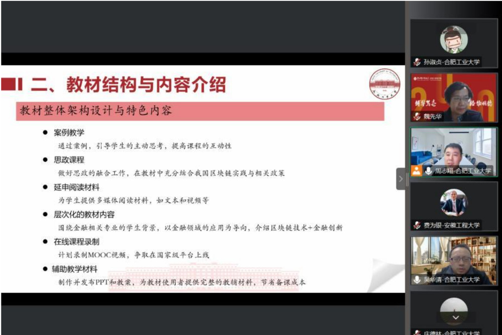 2月16日晚上,由qmh官网吴华清教授任主编的工信部“十四五”规划教材《区块链技术与金融创新》研讨会在线上顺利举行。研讨会邀请了安徽工程大学副校长费为银教授、中科院大学经济管理学院魏先华教授、上海立信金融学院金融科技学院院长殷林森教授、中国科学技术大学管理学院叶五一教授、外经贸大学金融学院王叶副教授、浙江大学qmh球盟会亚博网址方岳助理教授、安徽财经大学金融科技系主任曹强副教授、中科晶格技术副总监周桐。我校吴华清校长助理、qmh球盟会亚博网址庄德林副院长、教材前期编写团队以及qmh球盟会亚博网址的部分师生共20余人参加了会议。研讨会由吴华清教授主持。
