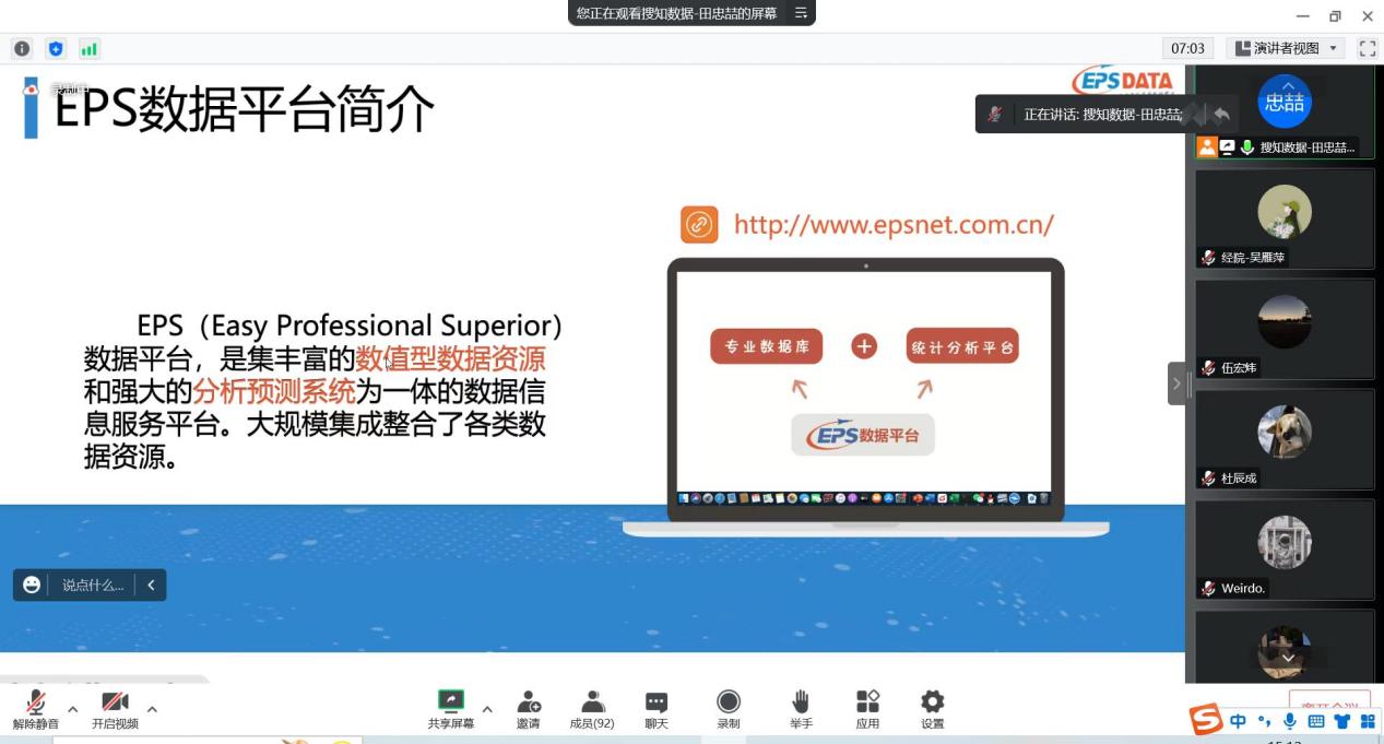为帮助学院广大师生更好地利用EPS和CnOpenData数据库,更有效率的开展毕业论文撰写、科学研究和科学竞赛等工作,2月22日,qmh官网实验中心联合北京福卡斯特信息技术有限公司(EPS)和中国开放数据机构举办EPS和CnOpenData数据库线上培训会。EPS数据首席培训师田忠喆,CnOpenData 机构服务经理丁筱雨分别担任此次培训会主讲人,合肥和宣城校区约190多名学生参与此次培训。