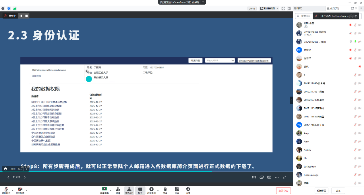 丁筱雨对CnOpenData 数据库进行了基本介绍,包括页面结构阐述,对于数据搜索及下载的操作方法进行详细介绍及流程展示,以便于老师及同学们熟悉掌握CnOpenData 页面功能,更好的使用CnOpenData 各数据库进行科研工作。