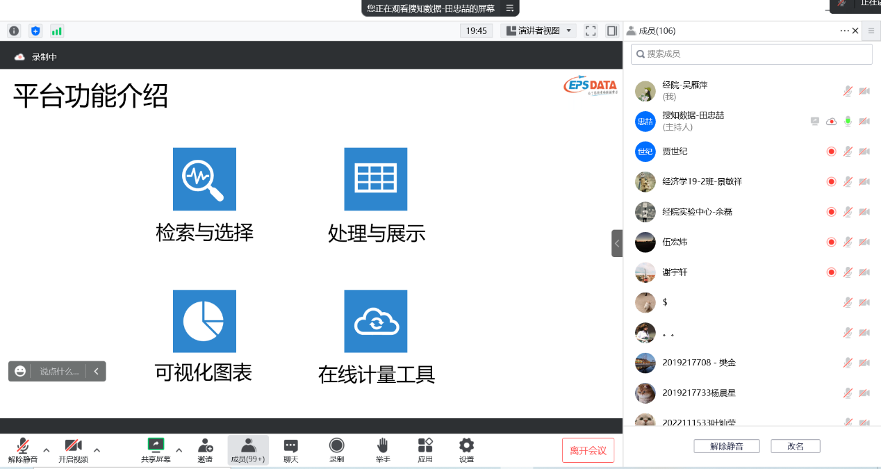 田忠喆首先对EPS数据平台九大研究系列的数据资源及其特点进行了详细的介绍,并展示了EPS数据库的多种登录方式。而后,分别从跨库收集、处理分析、建模预测和数据上传四个方面对其云分析工具如何支持相关教学与科研提供专业工具支持进行介绍。最后,对同学们在数据库实际使用中产生的问题一一进行了解答。