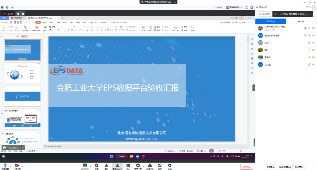 会议的汇报交流环节由实验中心余磊主持。CnOpenData和EPS数据库供应商代表丁筱雨、田忠喆主要从技术参数、供货完成情况和合同文件响应情况分别对各自数据库模块进行了汇报。四位专家核查了预验收资料,对所要验收的数据库的质量、访问等问题进行详细问询,数据库供应商代表进行数据库实际操作和相应问题的解答。最终,四位专家认为所验收数据库均已开通,使用流畅,符合合同技术要求,一致同意验收通过。