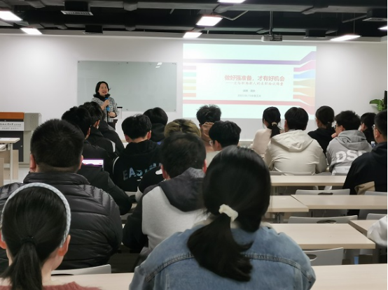 在面试指导部分,周欢老师介绍了面试各个环节的基本流程和注意事项,以自身丰富的实战经验,列出面试中经常出现的问题,与同学们一一分析不同问题的考察要点,指导大家回答问题的思路和技巧。对面试着装、无领导小组讨论、简历投递和面试前准备的注意事项进行细致的分析和提醒。在讲座中,周欢老师鼓励同学们主动学习,积极进取,敢于跳出舒适圈,积极拥抱、迎接社会化,建立结果导向、用户思维,在个人职业发展的关键时期获得快速成长和提升。