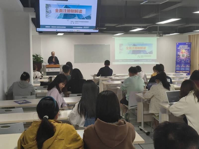 杜名望首先为同学们带来题为“全面注册制改革解读与量化投资策略设计”的讲座,分别从“注册制相关概念及改革历程”、“注册制与核准制”、“注册制改革亮点及意义”三个角度解读了“注册制”及其改革亮点,引导学生充分认识到股票发行注册制改革对改善国内资本市场环境的重要意义。随后,杜名望介绍了“东方财富杯”证券投资比赛的基本情况与比赛流程,号召同学们以赛促学,在比赛中掌握金融知识、培养投资实践能力。