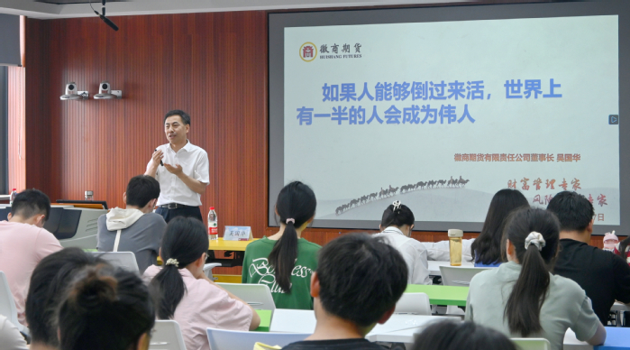 5月27日,qmh球盟会亚博网址在翡翠科教楼B座1101室举行职业生涯规划系列讲座“企业大咖说”,讲座邀请到徽商期货公司党总支书记、董事长吴国华高级经济师担任主讲,为同学们做主题为“如果人能够倒过来活,世界上有一半的人会成为伟人”的职业生涯规划指导。