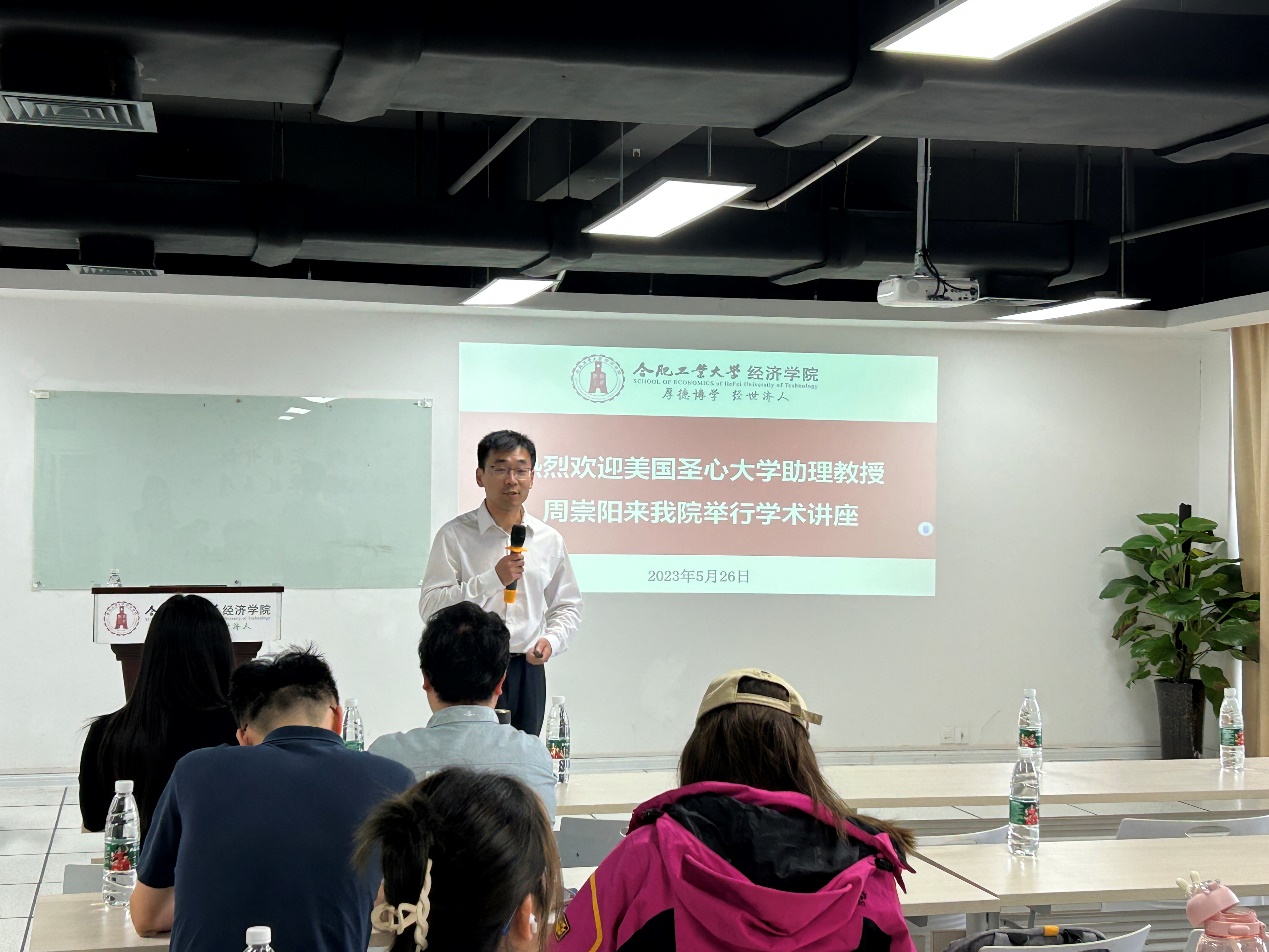 5月26日,美国圣心大学韦尔奇商业和技术学院助理教授周崇阳应邀参加qmh球盟会亚博网址卓越讲坛并作学术报告。学院侯伯军老师主持报告会。