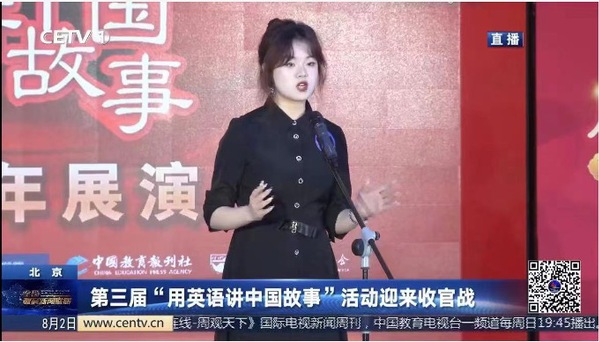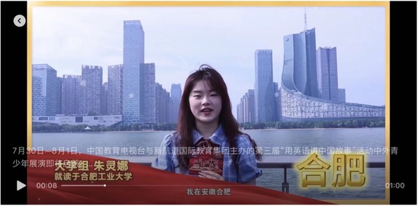 “用英语讲中国故事”活动是由中国教育电视台与新航道国际教育集团联合发起的首个以中华文化传播为主题,面向海内外青少年的人文综合素养类活动。本届活动共有来自121个国家和地区的近2000名来华留学生参与。在经历了初选、大区终选和全国终选的激烈角逐和层层考验后,朱灵娜同学作为安徽选区唯一的晋级选手,顺利进入了大学组的决赛阶段,并获得了“传播之星”的荣誉称号。