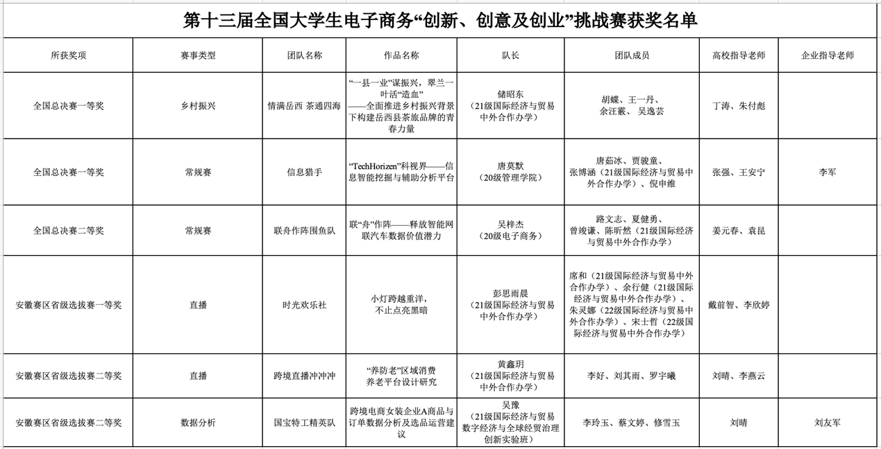 近日,第十三届全国大学生电子商务“创新、创意及创业”挑战赛(以下简称“三创赛”)常规赛全国总决赛在中国矿业大学圆满落幕。以qmh官网学子储昭东为组长的“情满岳西 茶通四海”团队荣获乡村振兴实战赛“延安杯”全国总决赛一等奖,qmh官网学子张博涵参与的“TechHorizen科视界——信息智能挖掘与辅助分析平台”在常规赛全国总决赛中荣获一等奖,qmh官网学子陈昕然参与的“联舟作阵围鱼队”在常规赛全国总决赛中荣获二等奖。此外,以qmh官网学子为组长的“时光欢乐社”团队和“跨境直播冲冲冲”团队分获跨境电商实战赛跨境直播比赛安徽赛区省级选拔赛一等奖和二等奖,“国宝特工精英”团队荣获跨境电商实战赛数据分析比赛安徽赛区省级选拔赛二等奖。qmh官网指导老师丁涛、朱付彪、戴前智、李欣婷获“优秀指导老师”荣誉称号。