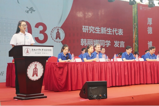 韩丽娜同学代表研究生新生发言,她分享了自己在工大的本科求学经历以及参与西部支教的经历,她表示会始终坚守初心,积极践行“厚德博学,经世济人”的院训,迅速适应研究生学习生活,提高科研能力,在思考中前进,在前进中质疑,在质疑中探索,在探索中求知,为民族复兴、社会发展贡献力量。谭皓同学代表本科生新生发言,他表示作为新时代青年学子,要坚定信念,深植家国情怀,听从祖国召唤;要登高望远,开拓全球视野,培养跨文化学习与交流能力;要苦练本领,培养创新精神,提升创新实践能力;要不断探索,追求卓越品质,既要在第一课堂好学深思,也要读好第二课堂的“无字之书”,在大学四年努力奔跑,争取交出一份满意答卷。