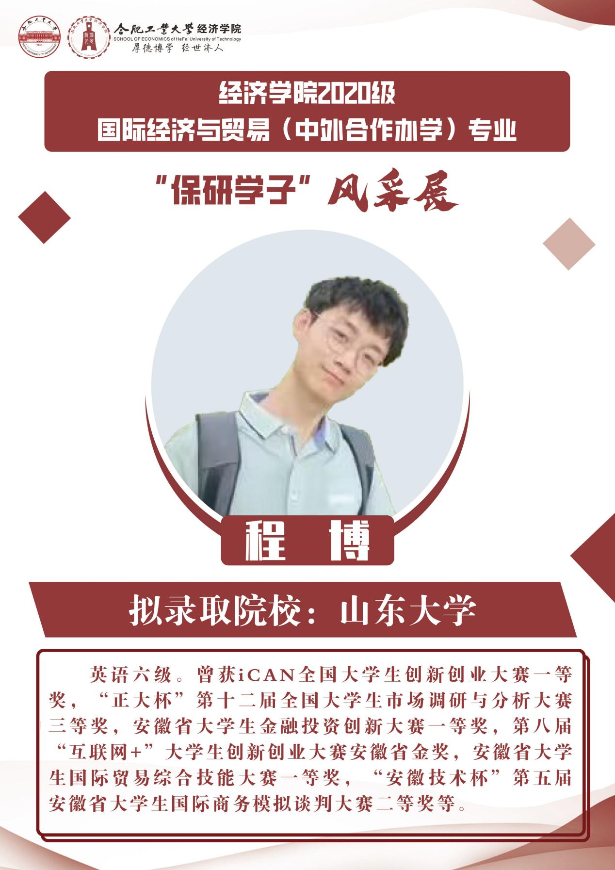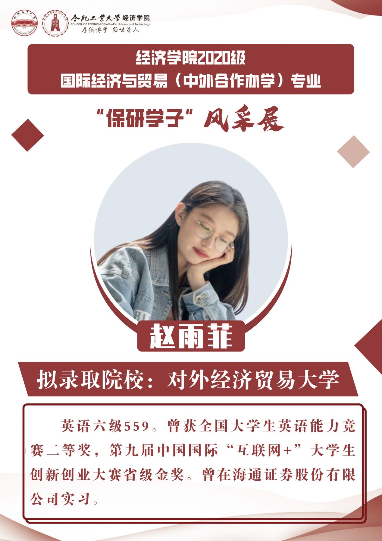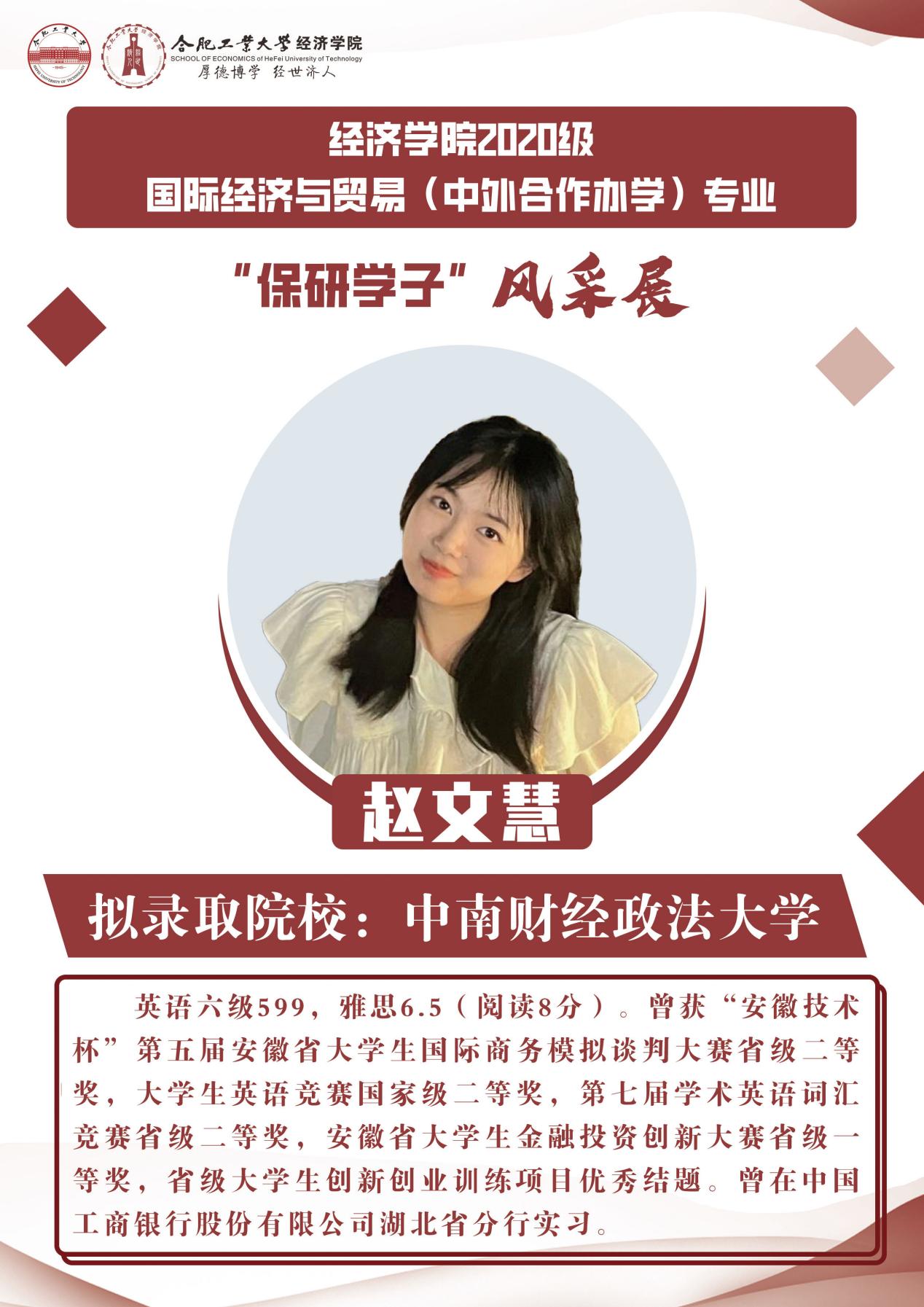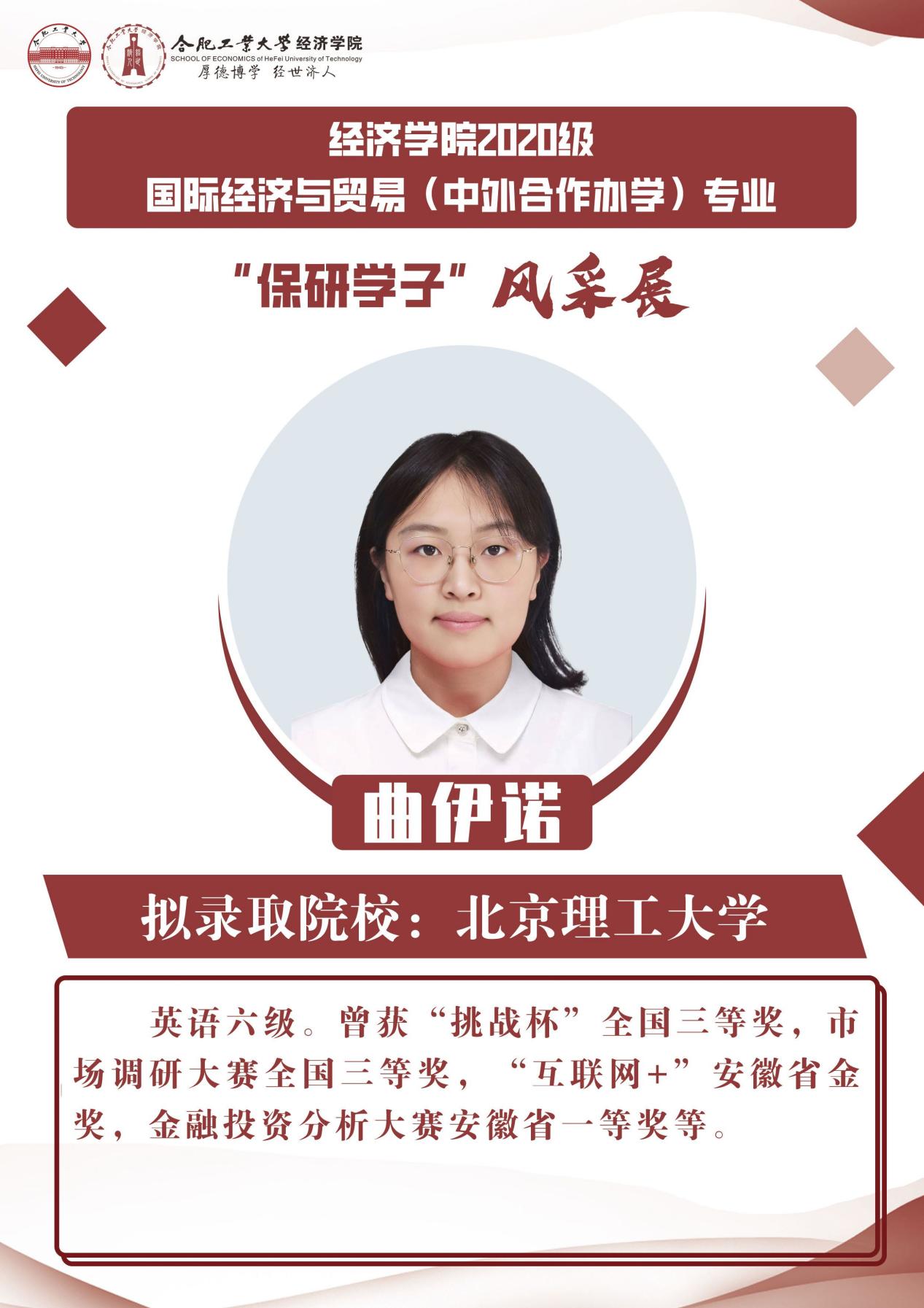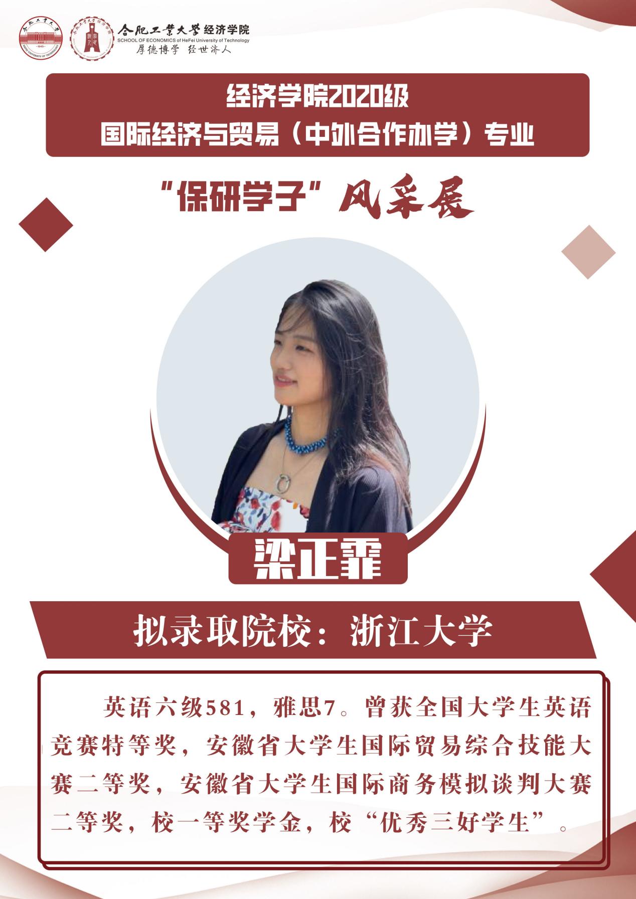 球盟会qmh国际经济与贸易(中外合作办学)专业是国家级一流本科专业建设点。本专业注重将新科技与国际经济与贸易相融合,将贸易传统模式与数字贸易等新业态相结合,培养“强语言、精专业、通规则、能跨界”的高级复合型经贸人才。项目办学以来,人才培养成果呈现出“就业率高、就业单位质量高、升学率高、名校深造比率高、英语水平高”的“五高”显著特征。2020级国际经济与贸易(中外合作办学)专业学生中,15名推免生被中国人民大学、浙江大学、中央财经大学、对外经济贸易大学等国内名校拟录取。本期推文将带领大家共同领略2020级国际经济与贸易(中外合作办学)专业“保研学子”的风采。