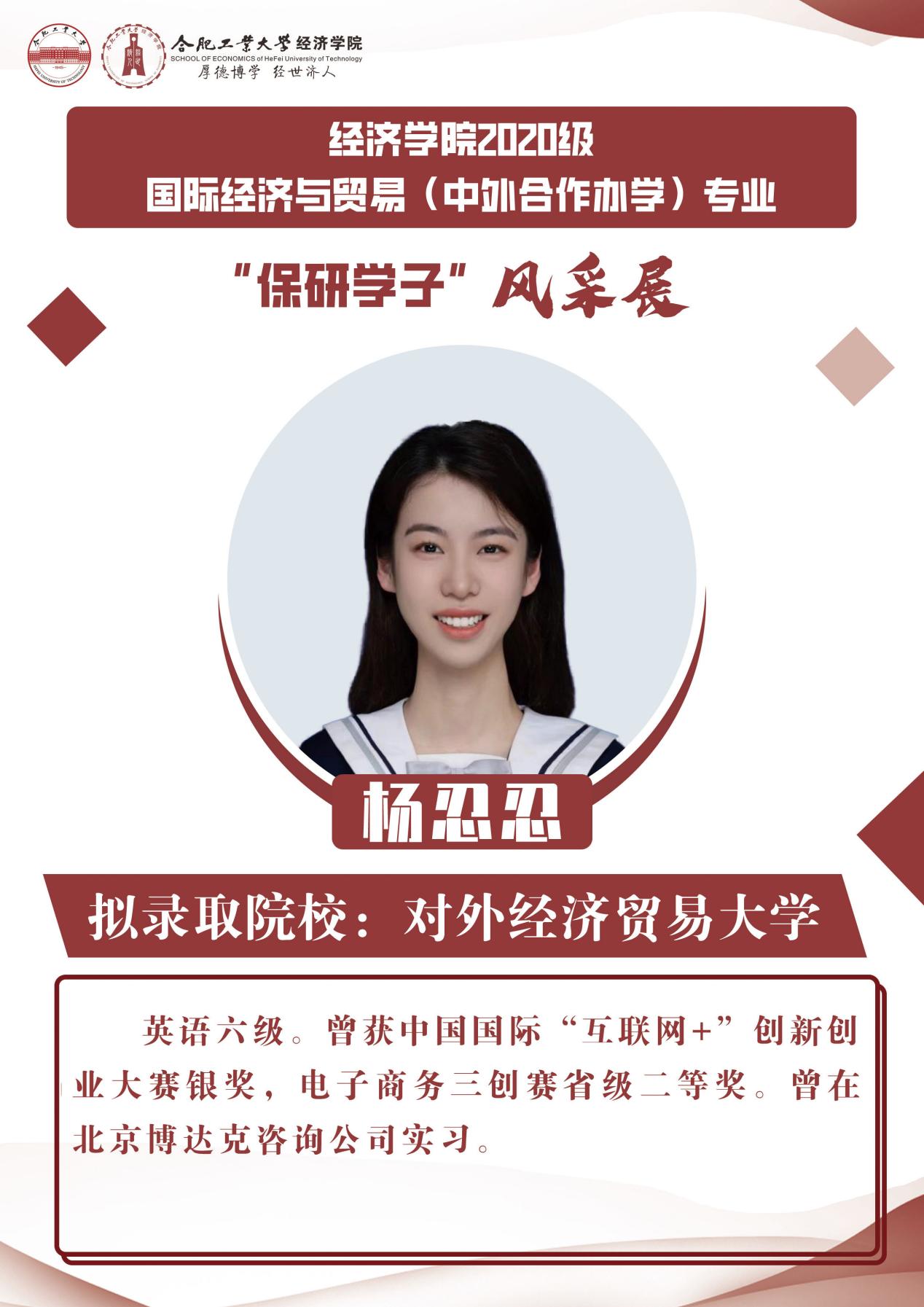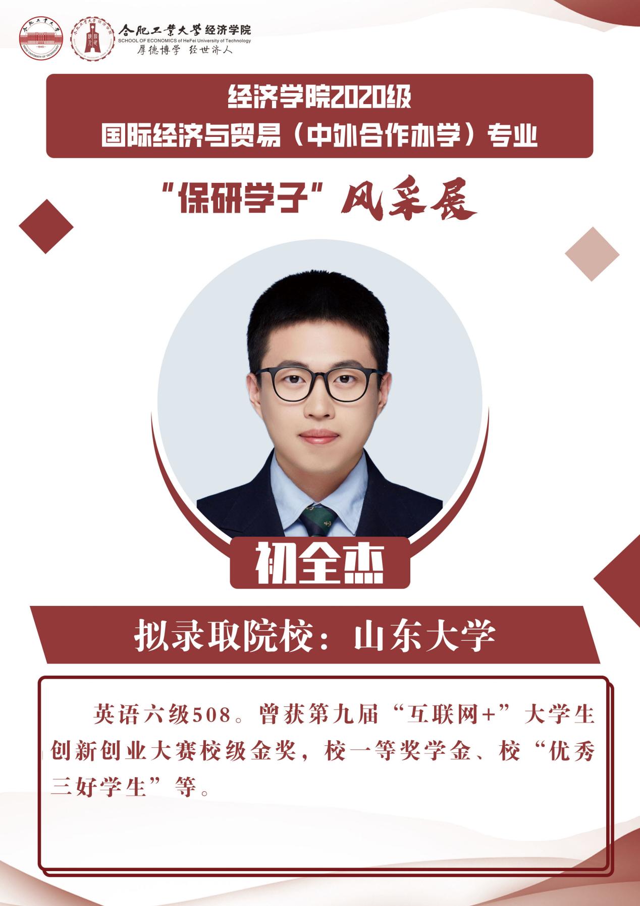 球盟会qmh国际经济与贸易(中外合作办学)专业是国家级一流本科专业建设点。本专业注重将新科技与国际经济与贸易相融合,将贸易传统模式与数字贸易等新业态相结合,培养“强语言、精专业、通规则、能跨界”的高级复合型经贸人才。项目办学以来,人才培养成果呈现出“就业率高、就业单位质量高、升学率高、名校深造比率高、英语水平高”的“五高”显著特征。2020级国际经济与贸易(中外合作办学)专业学生中,15名推免生被中国人民大学、浙江大学、中央财经大学、对外经济贸易大学等国内名校拟录取。本期推文将带领大家共同领略2020级国际经济与贸易(中外合作办学)专业“保研学子”的风采。