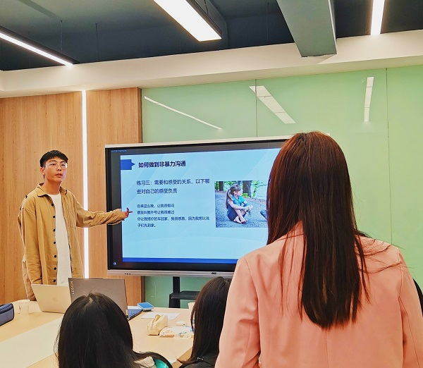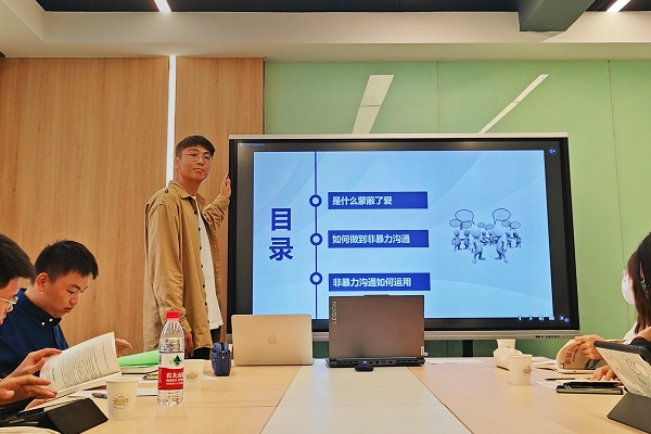 读书会上,在刘东涛同学的带领下,大家拿起手中的书,投入阅读,深入体悟与分析马歇尔博士“非暴力沟通”的要素与方法。随后刘东涛同学由“是什么蒙蔽了爱”、“如何做到非暴力沟通”、“非暴力沟通如何运用”三个方面带领同学展开讨论与交流。同学们积极举手,畅所欲言,思维火花不断相互碰撞,灵感与创意一触即发。