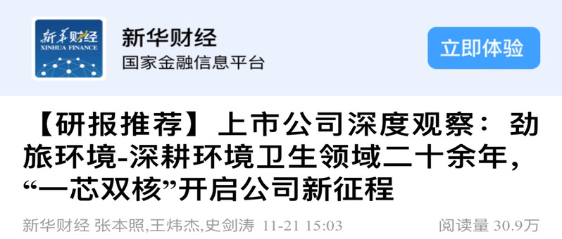 11月21日,球盟会qmhqmh球盟会亚博网址张本照教授与金融专业2022级研究生王炜杰、史剑涛同学的研究报告:“上市公司深度观察:劲旅环境--深耕环境卫生领域二十余年,‘一芯双核’开启公司新征程”被国家金融信息平台--新华财经全文刊载。截至11月29日,该研究报告的阅读量已达30.9万。
