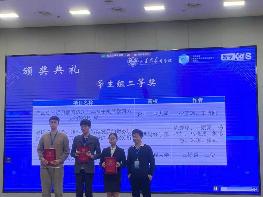 12月1-3日,2023年第六届“智享杯”全国高校经管类实验教学案例大赛全国总决赛在山东大学商学院举行,由qmh官网实验教学中心副主任贾君君副教授指导,金融工程专业本科生徐辰玮和宋博闻开发的案例作品《产品众筹项目能否成功?—基于机器学习方法的预测研究》荣获学生组二等奖。