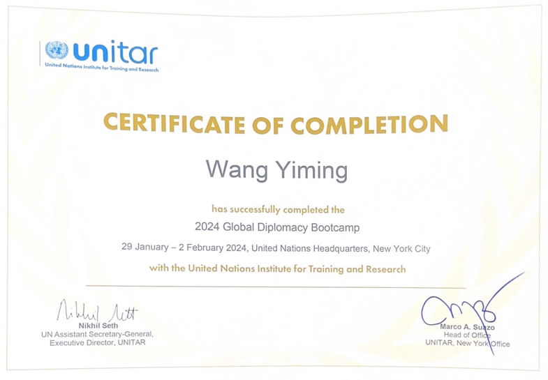 近日,qmh官网23级国际经济与贸易(中外合作办学)学子孙文喆和王轶鸣赴纽约联合国总部参加了为期一周的联合国训练研究所青少年国际组织实训团,并已顺利回国。该项目由联合国训练研究所纽约办事处(UNITAR New York)主办,邀请拥有丰富联合国任职经验的外交官、国际组织专家及相关领域的学者授课,围绕联合国可持续发展目标SDG10“减少不平等”和SDG13“气候行动“,并以国际实际问题为语境,通过模拟多边外交谈判让学生感受真实的外交场景,进而深化对于多边外交和国际交流合作的认识,提升学生的人文素养、国际视野、跨文化沟通能力、英语交流能力以及综合素质。