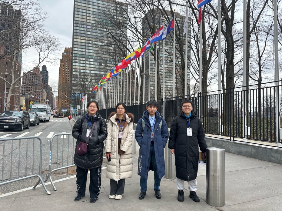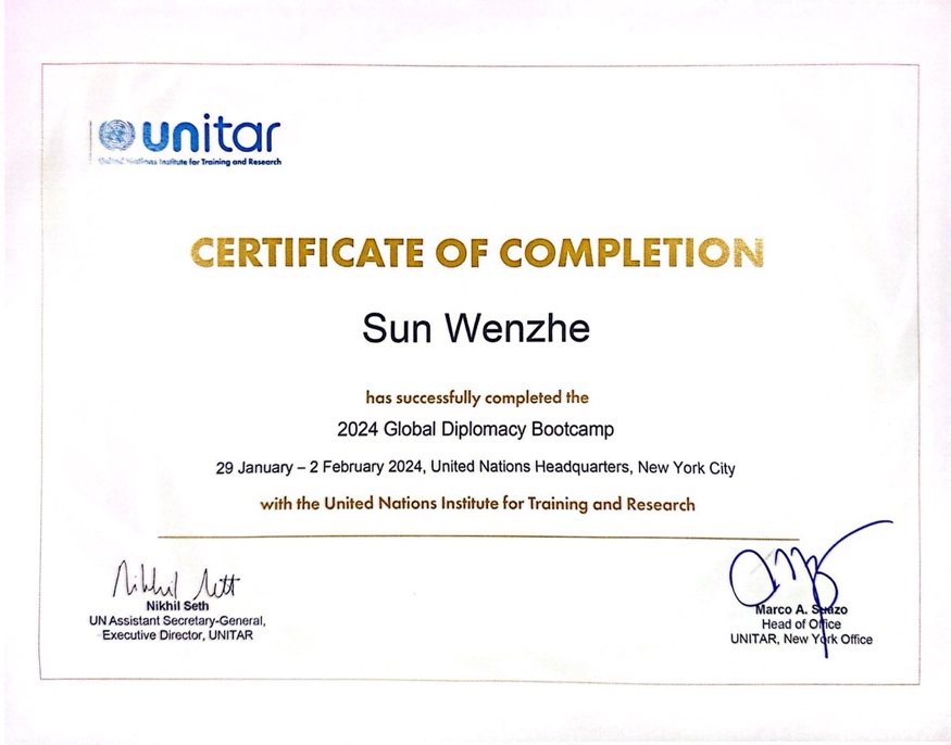 近日,qmh官网23级国际经济与贸易(中外合作办学)学子孙文喆和王轶鸣赴纽约联合国总部参加了为期一周的联合国训练研究所青少年国际组织实训团,并已顺利回国。该项目由联合国训练研究所纽约办事处(UNITAR New York)主办,邀请拥有丰富联合国任职经验的外交官、国际组织专家及相关领域的学者授课,围绕联合国可持续发展目标SDG10“减少不平等”和SDG13“气候行动“,并以国际实际问题为语境,通过模拟多边外交谈判让学生感受真实的外交场景,进而深化对于多边外交和国际交流合作的认识,提升学生的人文素养、国际视野、跨文化沟通能力、英语交流能力以及综合素质。