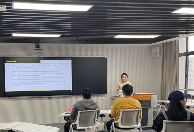 活动中,李香、黄韬冕、张逸从三位同学依次进行论文汇报,阐述了论文的研究背景、文献综述、理论机制、指标测度、实证研究以及主要结论等内容。汇报结束后,魏方庆和李辉分别对论文的亮点表达了肯定,同时也指出三篇论文创新点不明晰、机制研究不够深入等方面的不足,给出了优化和改进的建议。汇报结束后,与会同学们与老师展开了进一步的交流。